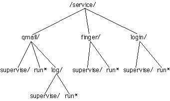 daemontools は、サービス管理用のディレクトリ・ツリーを使う。 ふつう、daemontools 用のトップレベルのディレクトリは /service にする習慣だ (こうしておくとあとあと便利だということがわかる)。 このディレクトリは、たとえば次のような構成になっている: