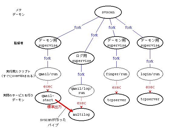 これはメタ・デーモンで、これだけはシステム起動時に 明示的に (rc 内あるいは手動で) 走らせるしかない。 しかしこれさえ走らせておけば、あとは svscan がその管理下の デーモンを supervise 経由で自動的に走らせてくれるよ。