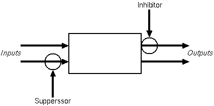 上層のモジュールは、Suppressor および Inhibitor を 使って下層モジュールのワイヤーに情報を「割り込ませる」ことができる。 ワイヤーを流れている情報は継続したものではなく、間欠的なパルスであるため、 その合間に情報を流せば複数の情報を混合することができるらしい。 「Suppressor」は、既存のワイヤーを流れている情報を「抑圧 (suppress)」し、 新しい情報を上書きする。しかし同時に前の情報も残すため、 これは or のような働きになる (実際には既存の情報をどれだけ残すかの割合が設定できるのかな?)。 いっぽう「Inhibitor」は 既存のワイヤーを流れている情報を「抑制 (inhibit)」し、 パルスを遮断する働きをもつ。これら 2つの端子をつかって モジュール同士をワイヤーレベルで接続することによりシステムが増築できる。