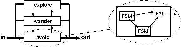 Subsumption Architecture では、 認識および行動は複数のモジュールが並列して行う。しかし、 実際にはロボットのソナーもモータも一組しかないはずだ。 各モジュールが互いに矛盾する決定をした場合、システムは それらの決定をどのように実際の動作に反映させるのか? Subsumption Architecture では、これを「Suppressor」および 「Inhibitor」という仕組みを使って解決している (図 3)。