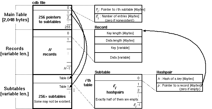 A cdb has a number of records which has a key and a datum, each of which can be in variable length (up to 4GBytes). The file format is designed for locating a record with as few seeks as possible. Although a cdb itself seems to have a flat list of key and datum pairs, in fact it has 2-level hierarchical tables to lookup. A cdb file consists of roughly three parts. Actual data which consist of an arbitrary number of key/datum pairs are sandwiched between two lookup tables. The first lookup table has always fixed size (2,048 bytes). The second lookup table is divided into at most 256 subtables, each of which has a variable number of entries, and is accessed from the pointer stored in the first table. (Fig. 1)