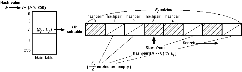 Each key/value pair is referred to by a small data structure which is stored in the second table. Here we call it a "hashpair" for convenience.