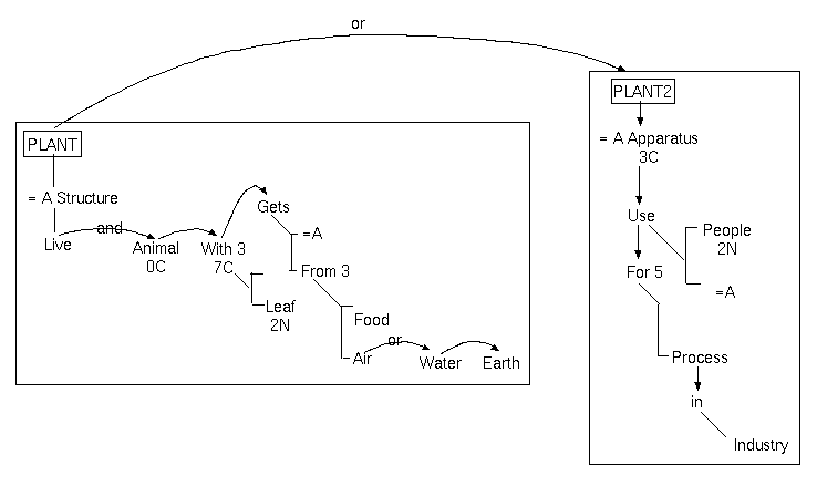 Quillian の意味ネットワークでは、多義語を扱うために概念そのものを 表すノード (type) と、それを表示する単語のノード (token) を区別する ことができた。たとえば plant (植物) と plant (工場) は別々の type ノードを 持っている。概念の詳しい定義や、他の概念へのリンクは各概念の type ノードに埋め込まれていた。また、subclass というリンクによって、 ある概念が別の概念の下位概念であることを示した。しかしこの ネットワークはかなり ad hoc (場当たり的) なもので、ひとつのノードに いろいろな属性や special link がくっついて大変見通しの悪いものに なってしまっていた。