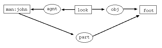 各 Concept は 1変数の特称限量子がついた述語と同値だが、 各 Concept-Relation は 2変数の述語に変換される。始点と終点が 第1引数と第2引数になるのである。図 10 は ``The man `John' looks at his foot.'' という文の Conceptual Graph であり、これは次のような述語論理に変換できる :