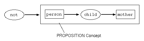 しかし、これだけでは一階述語論理における、いわゆるカッコが 使えないため、すべての一階述語論理を Conceptual Graph で表現できない。 そのため、Conceptual Graph を入れ子にできるように、Conceptual Graph そのものを入れることのできる Concept (PROPOSITION) を導入する。 これによって negation を含むすべての一階述語論理を扱うことができる。 この方法は C. S. Peirce によって開発された。図 11 は ``There exists a person with a mother.'' という命題を否定した「すべての人に母親が いるとは限らない」という意味を示した例である。