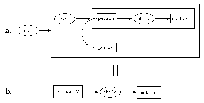 これによって、特称限量子だけでなく全称限量子も扱うことが 可能になる (図 12a)。点線は 2つの変数が同じものである (co-referent) ことを表す。 これができるのは「¬∃x ¬P(x)」という 命題が「∀x P(x)」と同値だからである。しかし、Sowa は 全称限量子を扱うもっと簡単な方法も用意している (図 12b)。