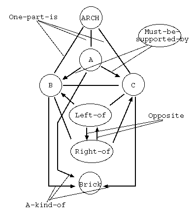 Winston の意味ネットワークでは、積木世界のそれぞれの物体を各ノードに 割り当て、「one-part-is」「opposite」 などのリンクでそれぞれの関係を 表現していた。しかし、位置関係や物理的な依存関係を示す 「left-of」や「supported-by」といった関係は ノードになっており、 計算機は「関係」そのものも概念として扱うことができた。しかし Winston はどのような関係をリンクとして表し、どのような関係をノードとして 表せばよいのかはっきりと表明していなかった。