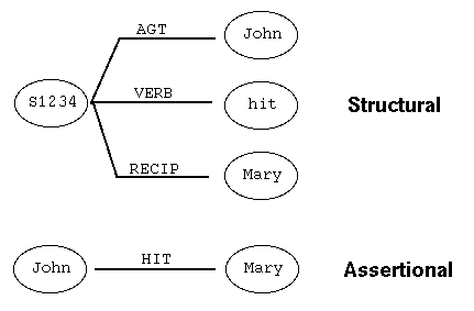 Woods はこのような区別、認識論的 (epistemological) な構造と 意味論的 (semantics) な構造を分けることは重要であることを主張し、 その例としてリンクの種類には 2つの本質的に異なるタイプ、 structural と assertional があることを指摘した。図 3 では、 文 S1234 の格がそれぞれ structural リンクによって結ばれており、 このリンク自体には何も意味論的な主張がない。一方、 ノード John と ノード Mary が HIT というリンクで結ばれているのが assertional である。ここでは「HIT」という名前をもつリンク自体が ものごとを「主張 (assert)」している。