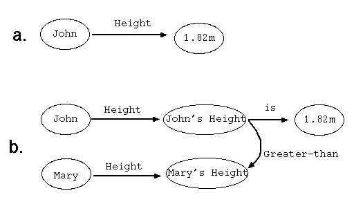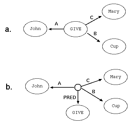 一方 Schubert は、意味ネットワークで述語論理を適切に扱う方法を 模索した (Schubert, 1976)。 それによれば、命題記号そのものをひとつのノードにするよりも (図 5a)、命題を表現する中心となるノードをまずひとつ作り、それに 命題記号や引数をつけるほうがよい (図 5b)。