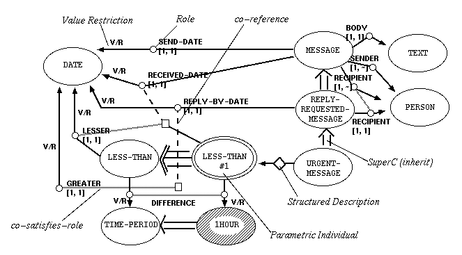 Role 間の関係は Structural Description で指示することができる。 図 6 では、URGENT-MESSAGE と呼ばれるノードの REPLY-BY-DATE Role が Parametric Concept である LESS-THAN-#1 ノードを会して RECEIVED-DATE に 接続しているが、これは「RECEIVED-DATE が REPLY-BY-DATE より 値 1 だけ小さいような REPLY-REQUESTED-MESSAGE」が URGENT-MESSAGEである、 ということを示している。