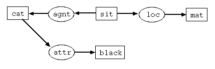 Conceptual Graph では格フレームを使用しており、格の種類には ATTR, AGNT, OBJ, MANR, LOC などがある。 図 7 は ``A black cat sits on a mat.'' という文をこれで表現してみた 例である。Conceptual Graph では、各 Concept は矩形で、Concept 間の関係である Concept-Relation は楕円で表現されることになっている。 各 Concept は、 Concept-Type を インスタンス化 して作られ、 Concept-Type は階層化して Type-Hierarchy と呼ばれる構造を作る (図 8)。