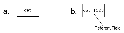 具体的な構造の説明に入る。図 9a は CAT のインスタンス cat が 存在していることを示す Conceptual Graph で、その意味は ``There exists a cat.'' となる。Conceptual Graph はすべて 1対 1の対応で 一階述語論理に変換でき、図 9a の場合は「∃x cat(x)」となる。 この場合の cat は CAT のひとつのインスタンスにすぎず、その存在はあくまで 不特定の「a cat」である。特定の cat を示すようにしたい場合、 Concept に追加できる Referent Field と呼ばれるものを用いて、 図 9b のように表すことができる。
