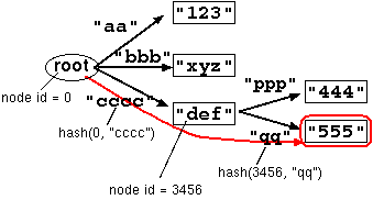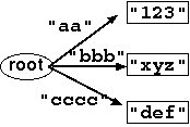 tcdb achieves compatibility with the original cdb format, i.e. you can read any cdb file with the tcdb tools, and you can also read some tcdb files with the cdb tools. The trick is that cdb files are just special cases of tcdb files representing a ``flat'' tree: all the nodes are direct descendants of the root node (Figure 2).