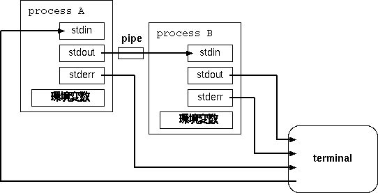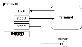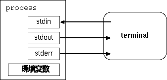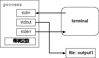各プロセスは、ファイルに読み書きするのと同じように、 標準入力や標準出力を読み書きできる。ただしこれらはファイルそのものではなく 「ファイルに結びつけられているポインタ」であるところが違う。 また、これらは切り替えることができる。