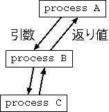 このような状況の場合、プロセス C の終了状態はプロセス B に 渡される。プロセス B の終了状態はプロセス A に渡される。 これは以下のようなプログラムに似ている。